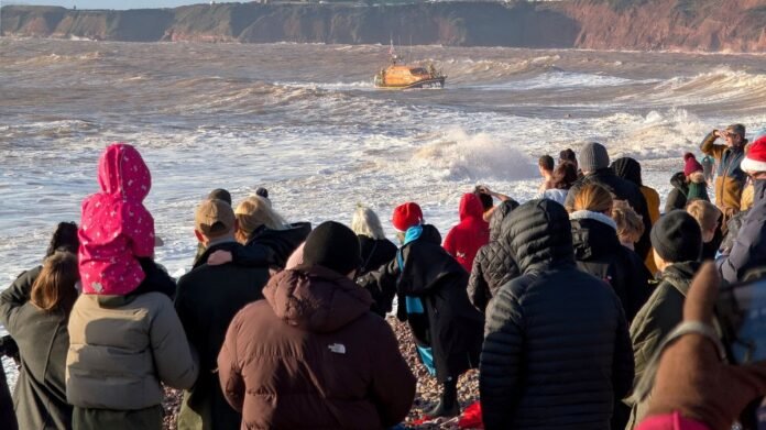 Dramatic recent images capture the scene as numerous individuals participated in a brisk Christmas Day swim before two swimmers went missing. Responders quickly arrived at Budleigh Salterton Beach in Devon following concerns raised during the annual wild swimming event. Many participants were safely brought back to shore, with some receiving medical attention as a precaution.