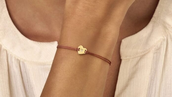 One standout piece is the Embrace Heart Cord Bracelet, priced at £52. This bracelet features a delicate gold pendant on red cord ties, with a sterling silver heart plated in 18-carat yellow gold and adorned with three real 0.9mm white diamonds.