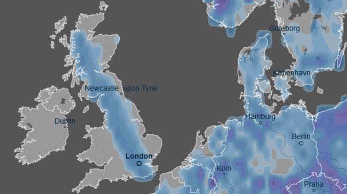 A forecast map predicts significant snowfall for the United Kingdom and other parts of Europe